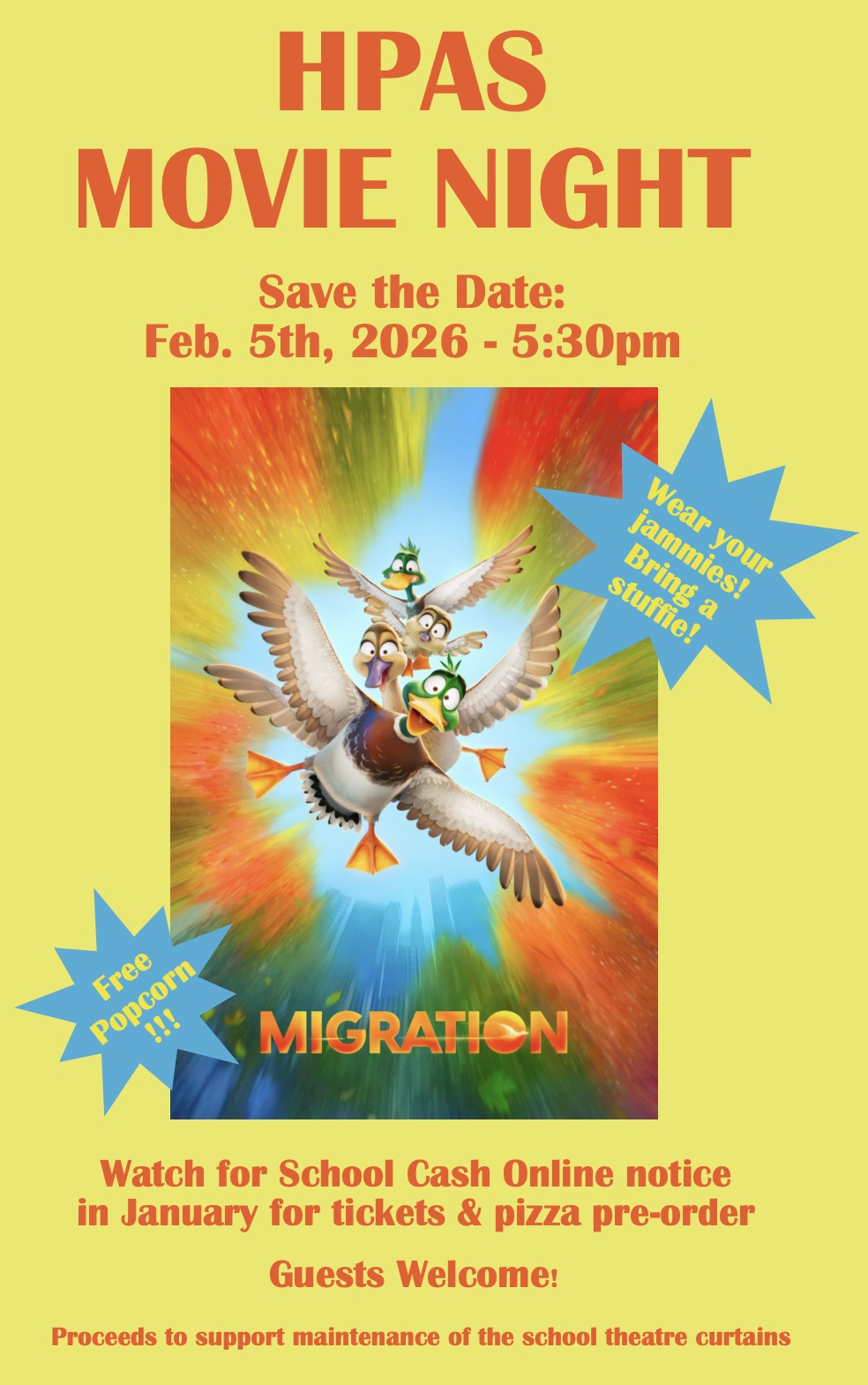 Doors open at 5:15. It’s Movie Night at HPAS! We’ll be showing Migration, a 1-hour-22-minute animated film about a cautious father duck who leads his family on their first adventure beyond the pond. It’s a story full of heart, humour, and helpful friends.